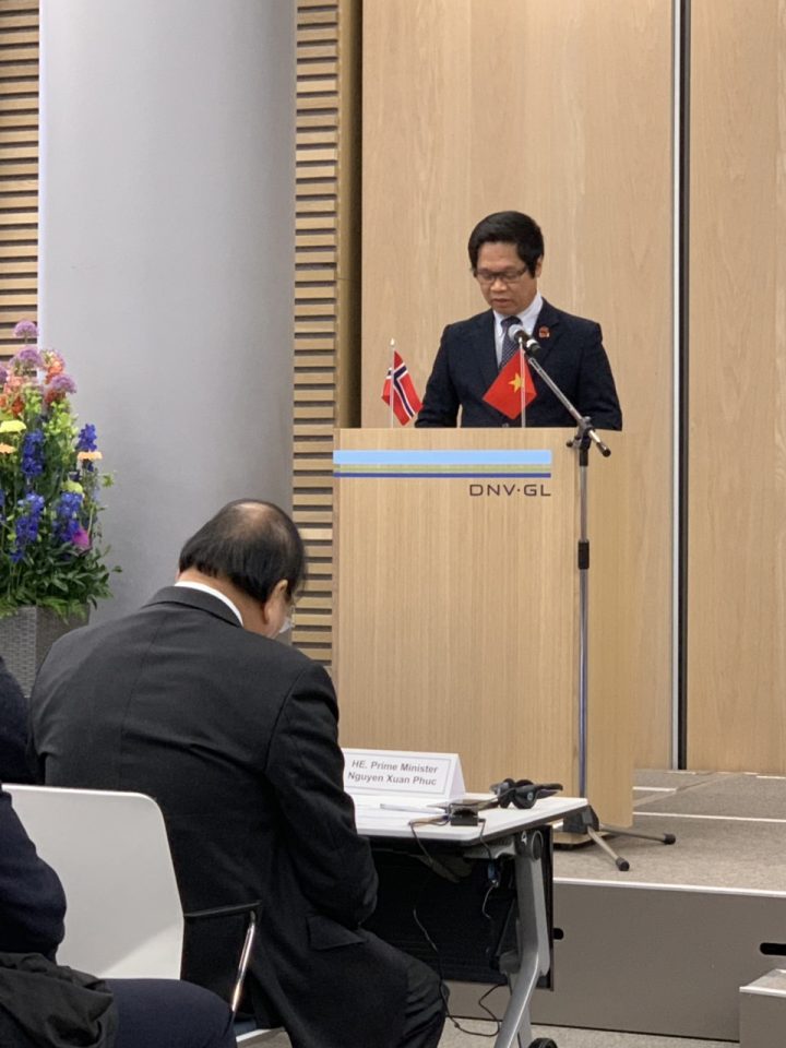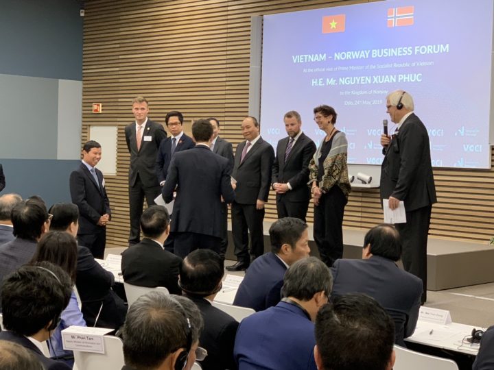 Sáng 24-5, tại Thủ đô Oslo, trong khuôn khổ chuyến thăm chính thức Vương quốc Na Uy, Thủ tướng Chính phủ Nguyễn Xuân Phúc đã dự và phát biểu tại Diễn đàn Doanh nghiệp Việt Nam – Vương quốc Na Uy, do Phòng Thương mại và Công nghiệp Việt Nam và Phòng Thương mại và Công nghiệp Vương quốc Na Uy phối hợp tổ chức. Diễn đàn là cơ hội để các doanh nghiệp hai nước gặp gỡ, tăng cường kết nối, trao đổi cơ hội hợp tác kinh tế, thương mại và đầu tư.